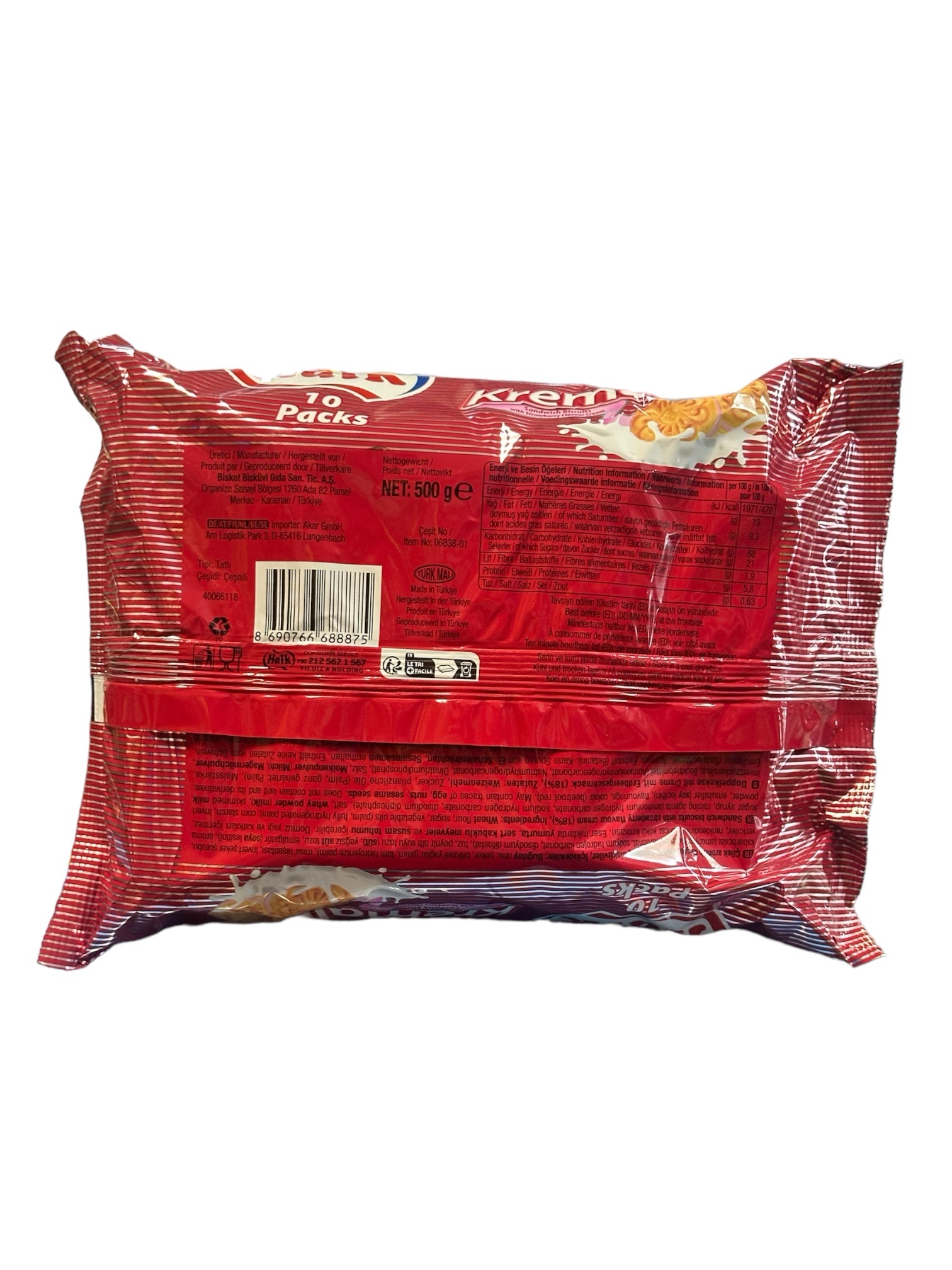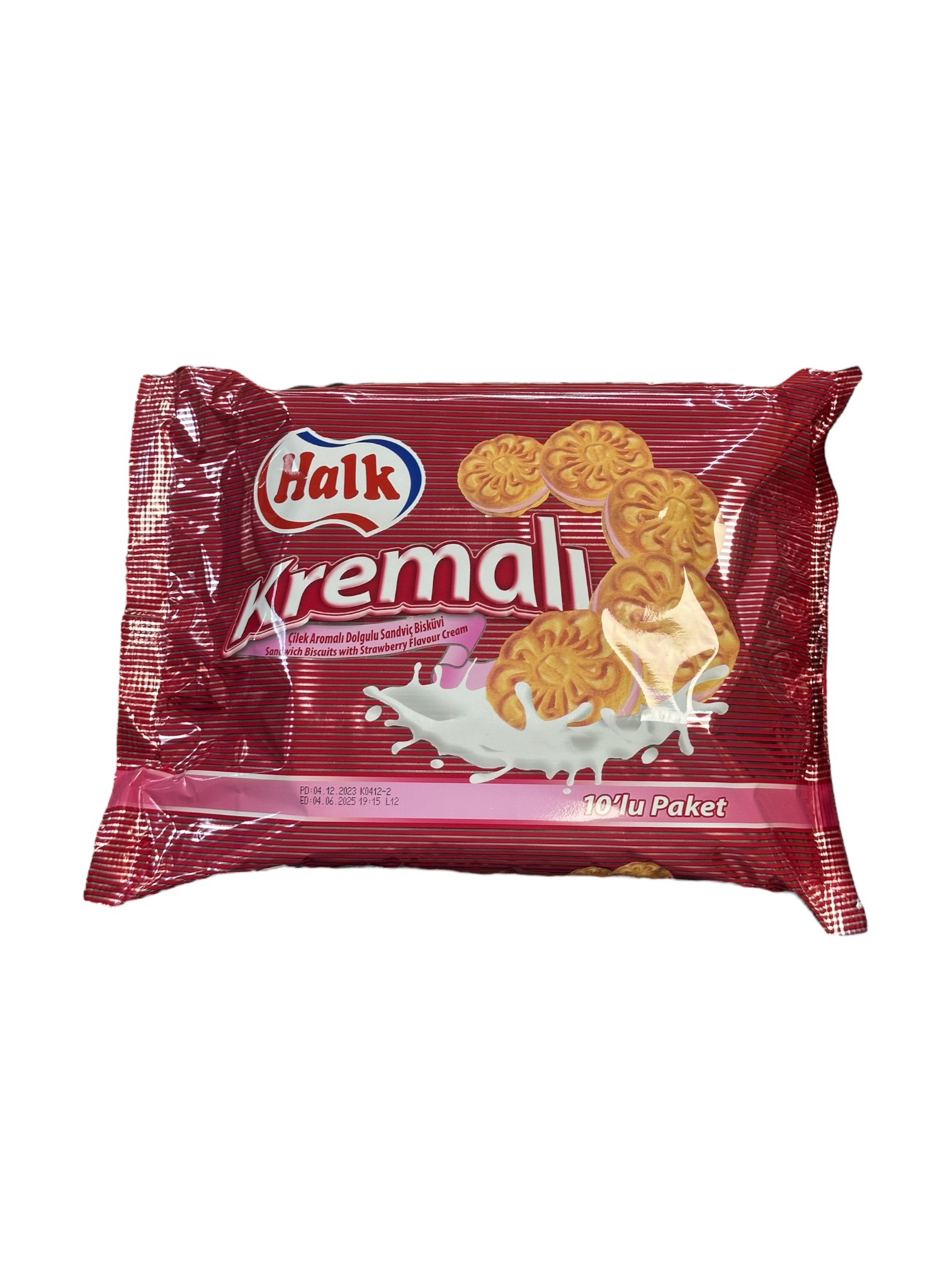 Die Halk Kremalı Doppelkekse mit Erdbeercreme bestehen aus zwei knusprigen Kekshälften, die mit einer zarten Erdbeercreme gefüllt sind. Ideal für Naschkatzen, die den fruchtigen Geschmack von Erdbeeren lieben.