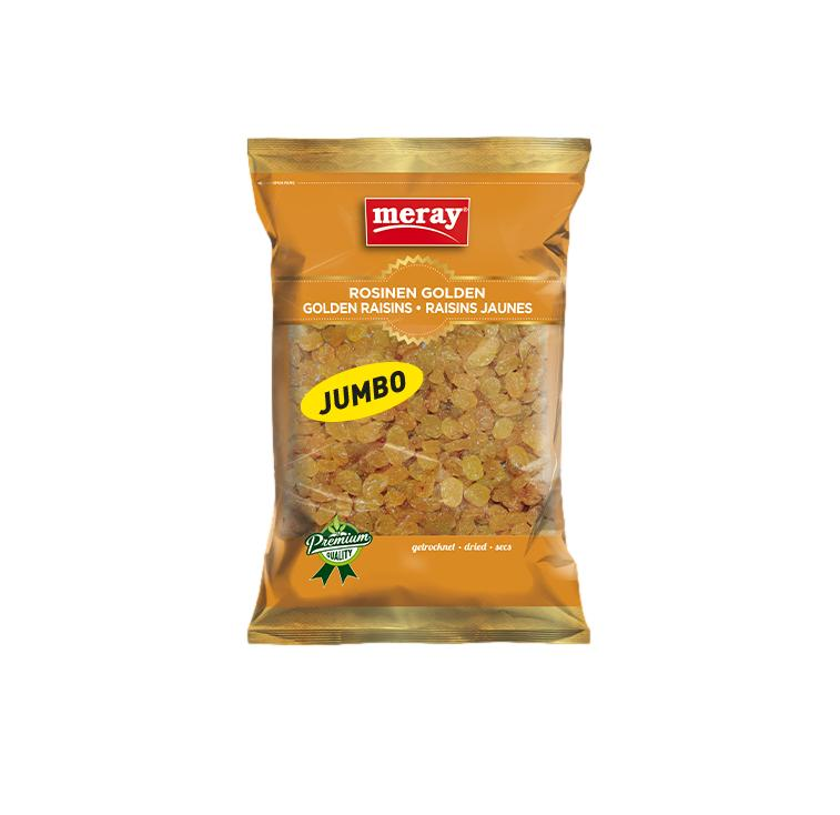 Groß, saftig, intensiv: Meray Jumbo Rosinen Gold sind der König unter den Trockenfrüchten – ein Genuss der Extraklasse.