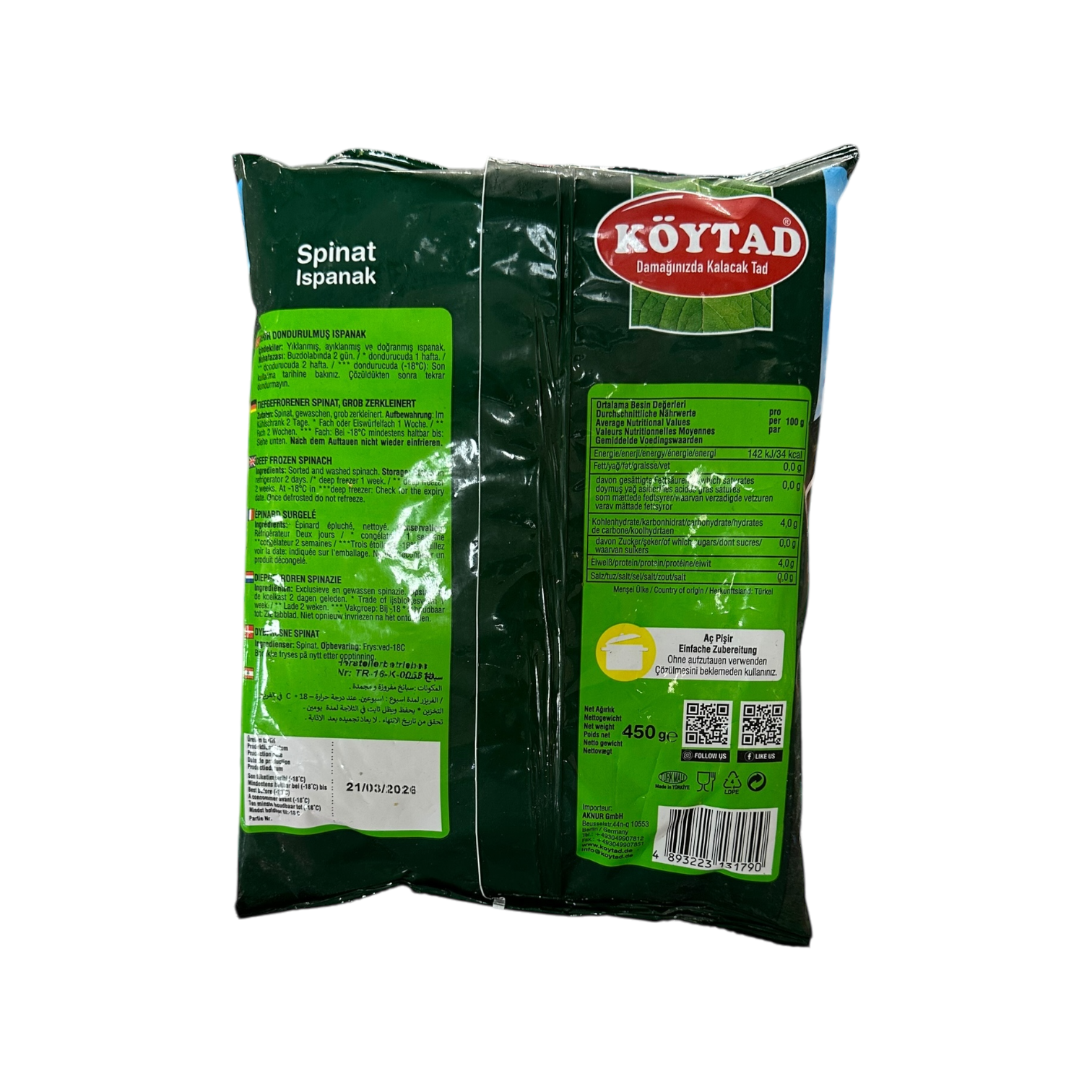 Köytad Spinat ist tiefgekühlter, frischer Spinat, der seinen natürlichen Geschmack und Nährstoffe behält. Ideal für Suppen, Eintöpfe, Quiches oder als Beilage – schnell und einfach zuzubereiten.